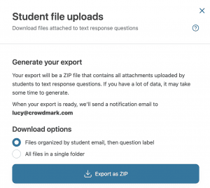 - Student file uploads: Download files attached to text response questions. Select Export ZIP. This opens a modal window with two options to choose from: