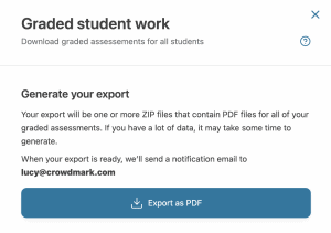 - Graded Student Work: Download graded assessments for all students. Select Export PDF to open a modal window, and click Export as PDF. When your export is ready, you will receive a notification email with a zip file containing each student’s submission in PDF format.