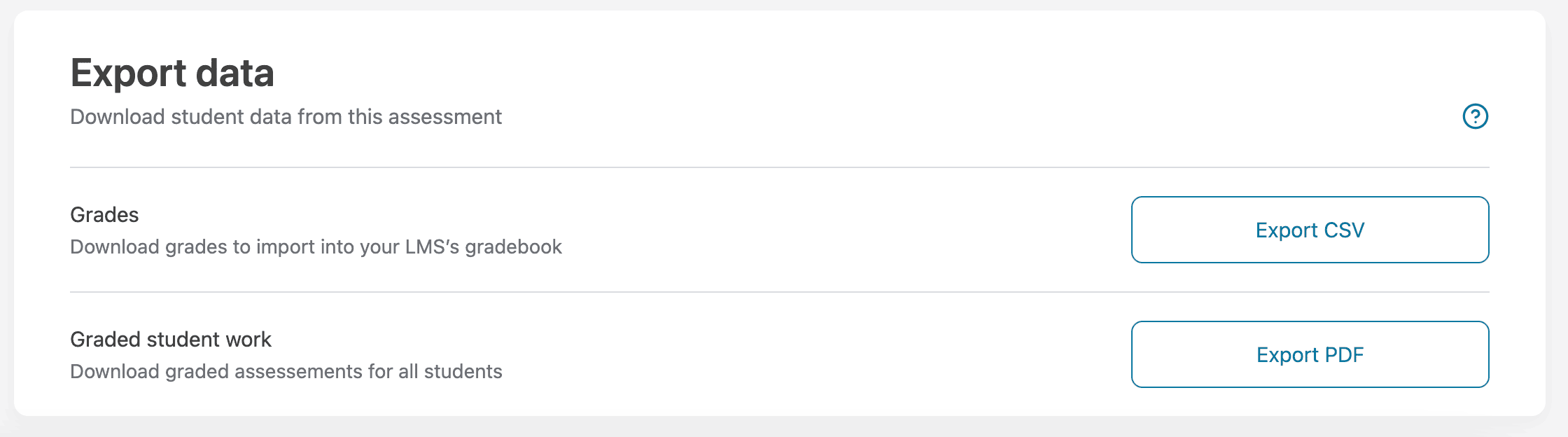 - Grades: Download grades to import into your LMS’s gradebook. This can be used to import into a gradebook, or for any other type of record keeping or data manipulation. Select Export CSV to generate a spreadsheet of student grades by question. See more details here.