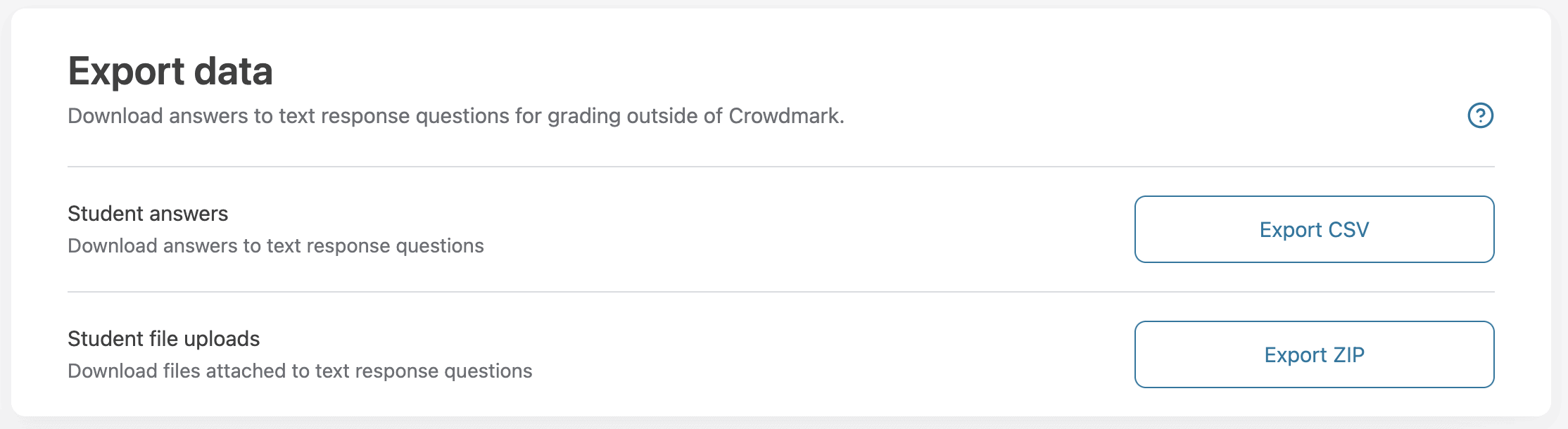 - Student answers: Download answers to text response questions. Select Export CSV to generate a spreadsheet of students’ typed responses in the assessment by question. This spreadsheet also contains links to individually-downloadable attachments.