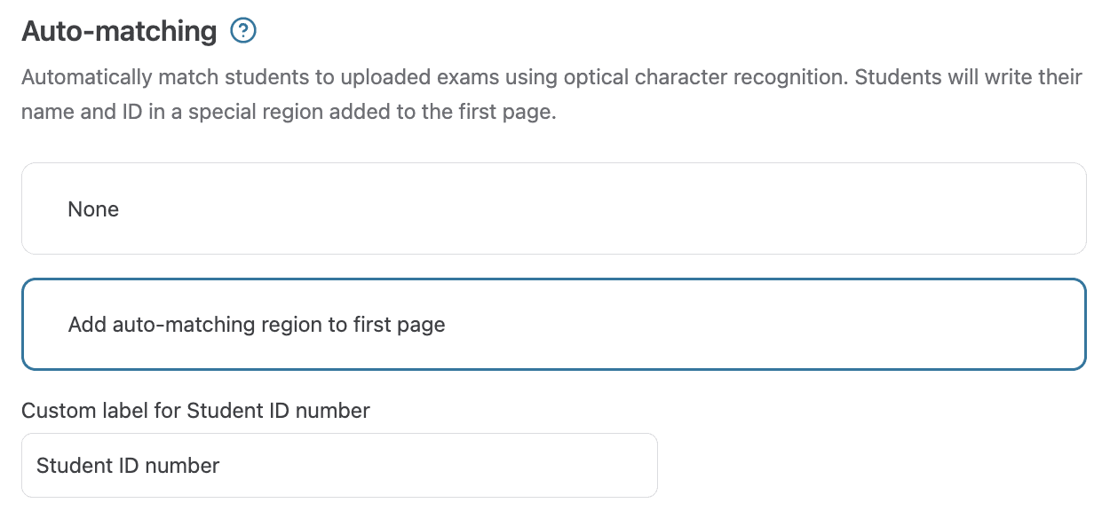 Enable automated matching when setting up your assessment template. When you upload your template you will have the option to enable automated matching. Select this option. You may customize the Student ID label to be more meaningful to your students. Upload your template and finish the assessment setup process.